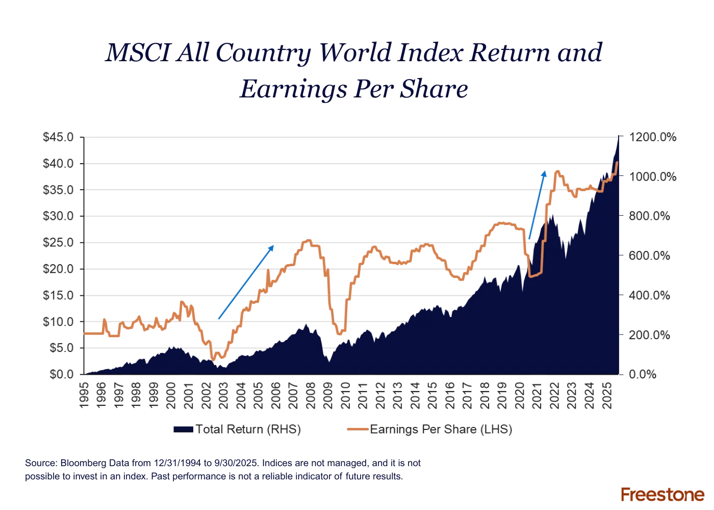 Despite shifting narratives, one truth continues to anchor equity markets: over time, earnings drive returns.