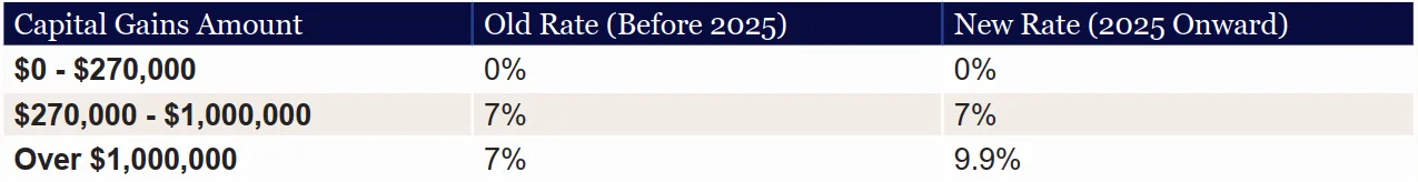 - 9.9% tax on gains over $1 million (up from 7%)